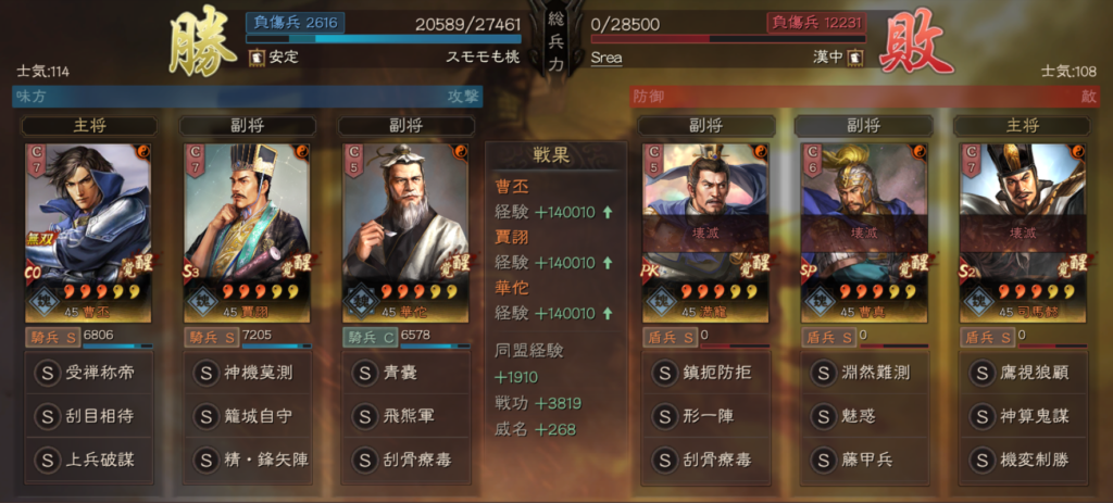 初段は曹操に与えるダメージが869、2回目が3436と大きな差があります。ダメージの種類は戦歴上では確認できません。ダメージ差が大きいのである程度は見て把握はできると思います。ざっくりとしたダメージ計算で言えば、兵刃ダメージであれば、無双曹丕の武力-対象の敵武将の統率の差が大きければダメージが増えます。計略ダメージは無双曹丕知力-敵武将の知力の差になります。地味ですが、SP劉曄固有による知力吸収と竭力佐謀による知力下げ効果は無双曹丕の火力に影響を与えます(属性値の移転にも繋がる)。