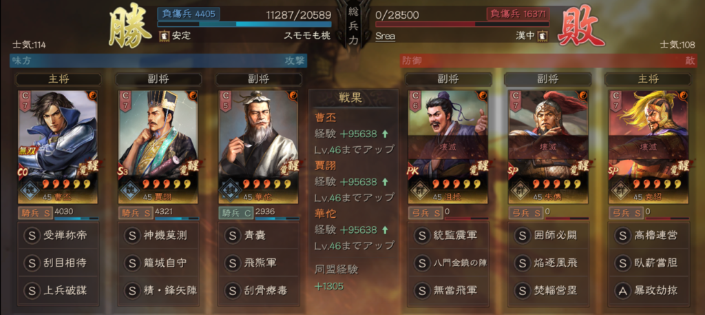 火力重視なら上兵破謀採用。回復重視は草船借箭を採用します。上兵破謀による火力は強力なので私は上兵破謀を優先しています。基本的には司馬懿と無双曹丕が近似した使用法になっていますが、より序盤から火力を出せる無双曹丕、中盤以降に爆発的な火力を出す司馬懿といった違いがあります。無双曹丕のほうがランクアップの影響を強く受けるため、編成強度の差異は大きいと思います。