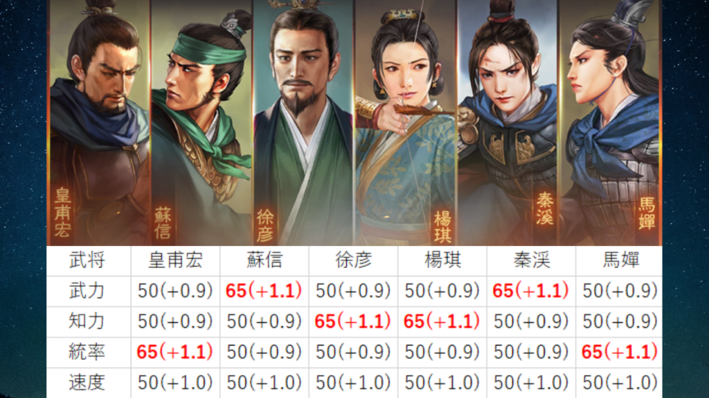 男女ともに武力、知力、統率とそれぞれの属性値が高い武将がいます。知力属性が高い武将を育てたい場合は知力属性が高いカスタム武将を登用し、自分の手持ちの師匠武将を選択し、固有戦法を引き継ぎます。基礎属性値は上記の表の通りですが、品評によって基礎属性値や属性成長値が変動します。