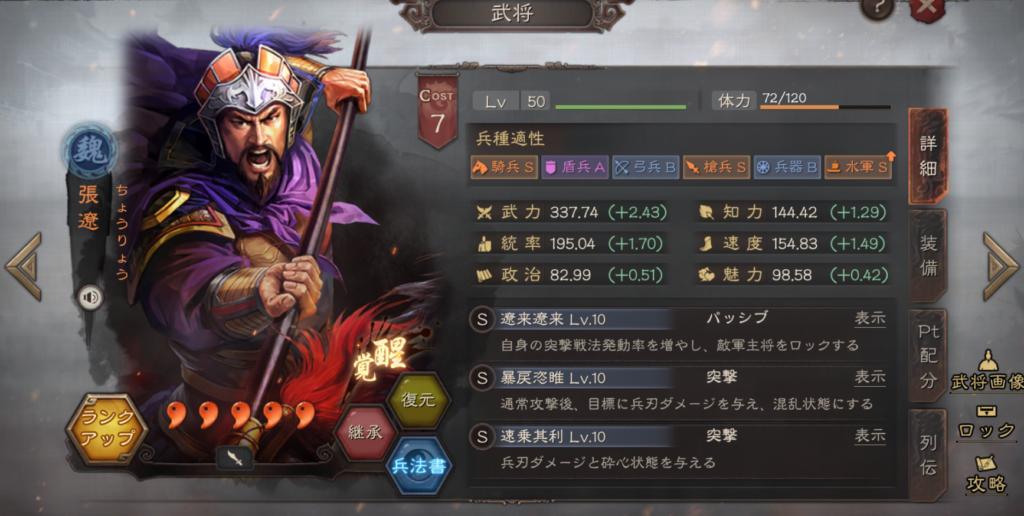Lv45のカスタム武将で武力は320を超えています。完凸Lv50張遼の全武力振りで337と考えると特化型の属性値は非常に高いものになります。しかし、知力や統率などの数字は非常に低く、かなり打たれ弱い武将になるので、その点が注意が必要になります。