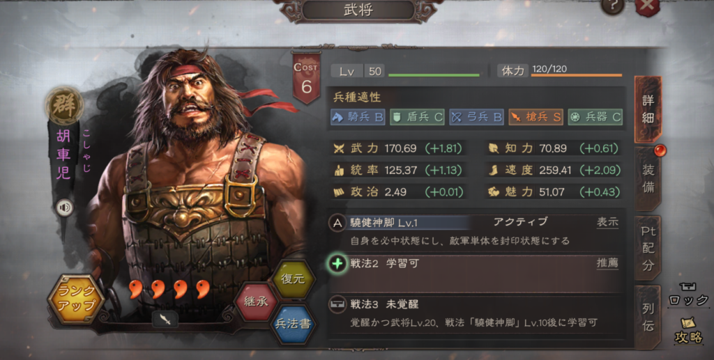 - 弱に遇えば強(レベルが自身より低い敵武将に対する与ダメージが5%上昇し、レベルが自身より高い敵武将に対する与ダメージが5%低下する)