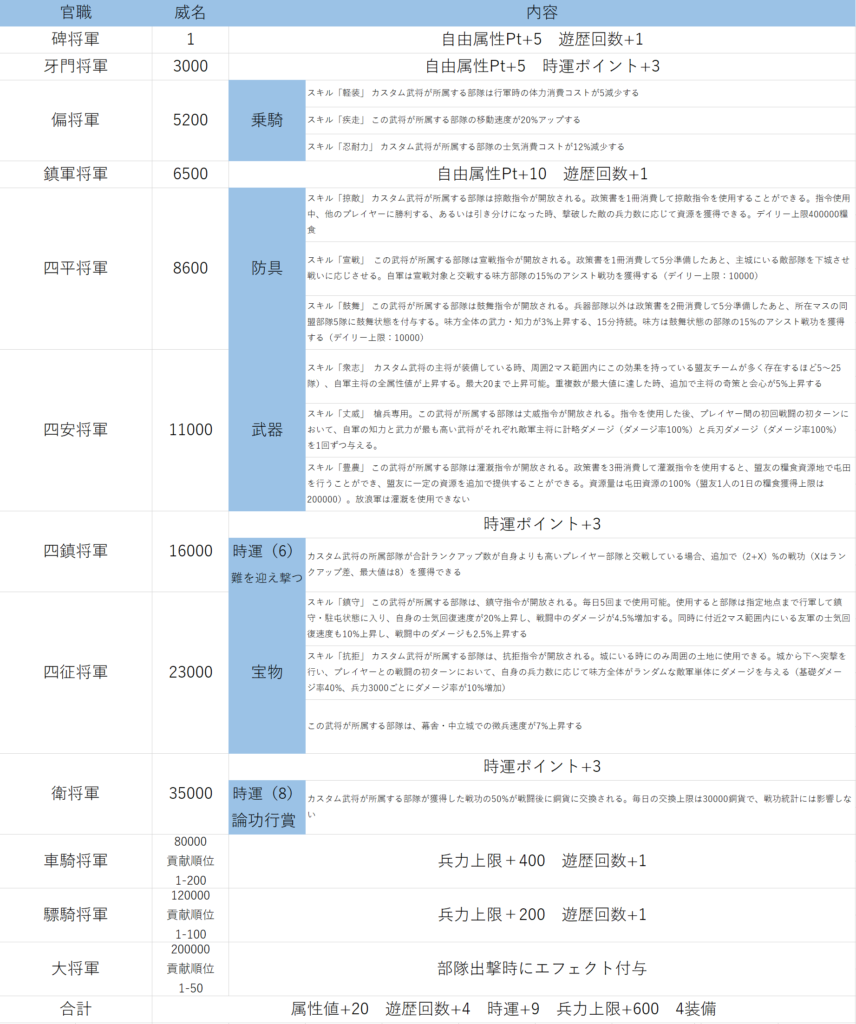 官職は威名累計が一定以上になると官職が上がります(一部は貢献値順位が条件)。