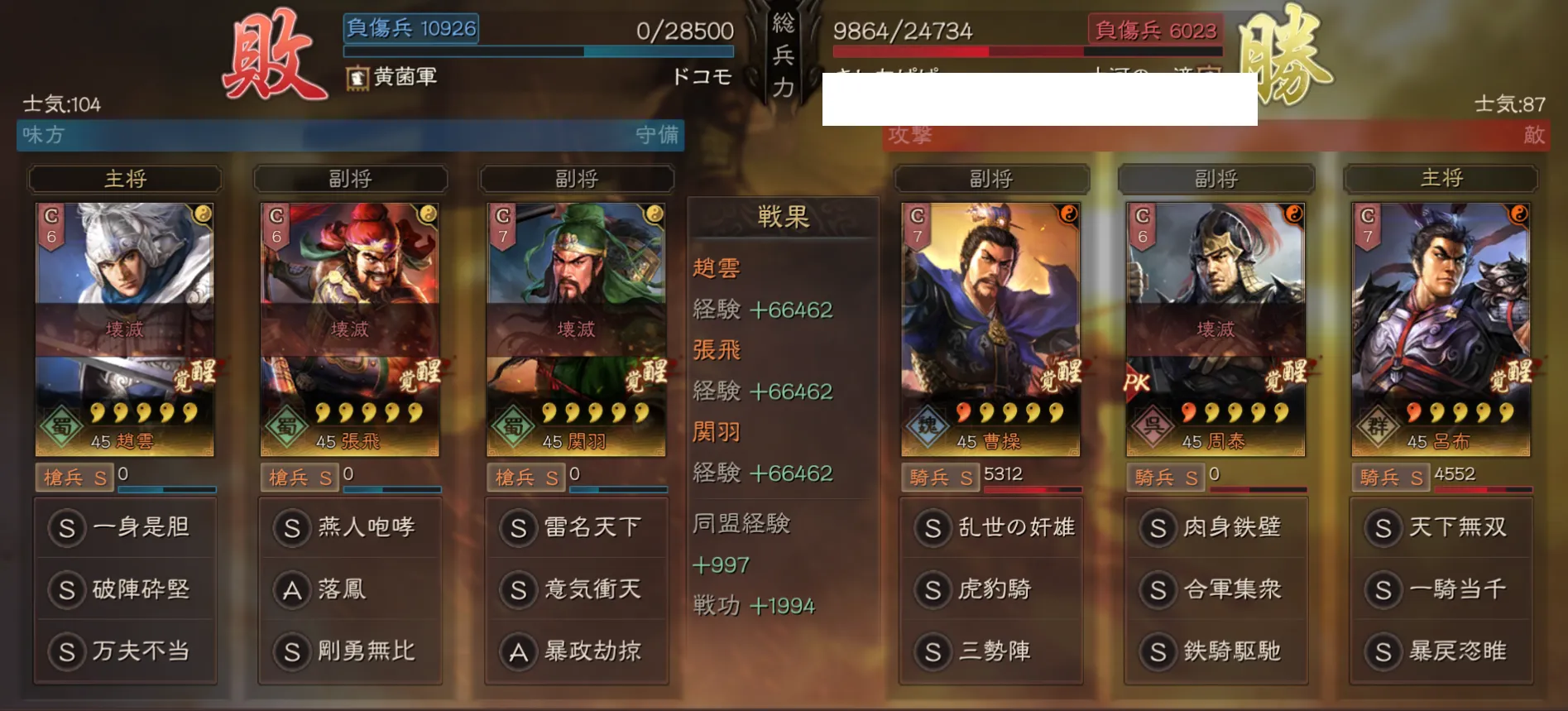関羽は主将でもOK。制御確率が上昇するため、臥薪嘗胆がない場合などは関羽で制御付与数を増やすといいだろう。箕形陣や奇計良謀などの被ダメ減戦法や意気衝天+千軍一掃+張飛固有のシナジーで押し切る編成でも充分活躍する。