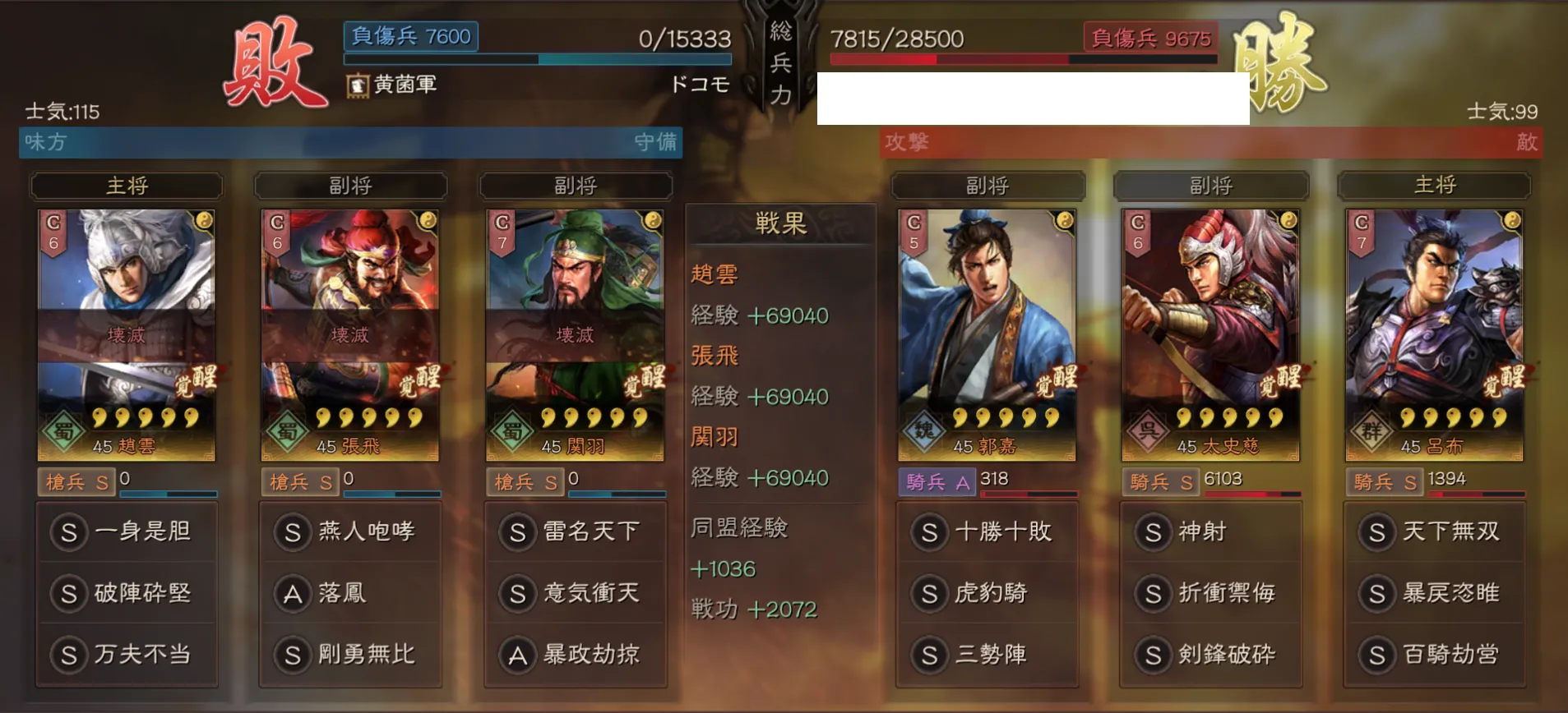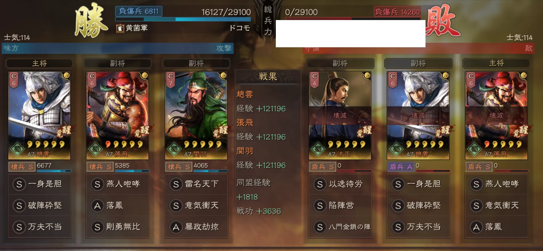 張飛(剛勇無比+絶地反撃) 兵法書:勝敵益強+常勝+執鋭 代替戦法:落鳳 大戟士