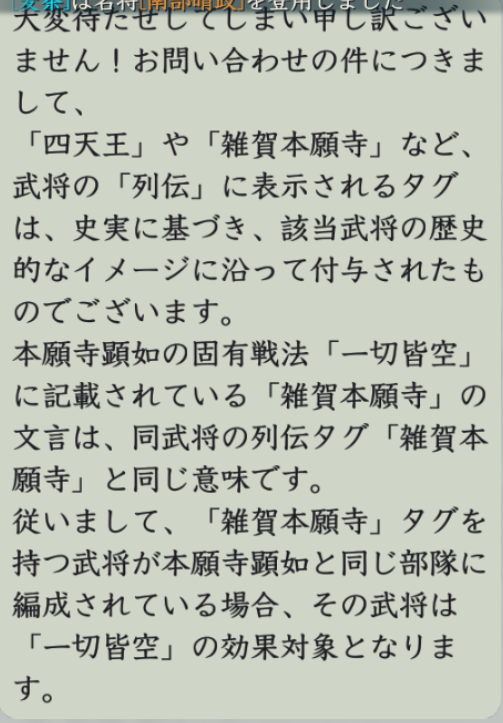 千軍辟易+気炎万丈/飯富虎昌/北条綱成などと合わせると威圧付与が可能になるのでお勧め。それ以外にも奇謀独断や槍弾正、沈魚落雁などの無策付与も合わせるのも悪くない選択です。スタダ期は千軍辟易+気炎万丈で攻守のバランスに優れた編成方法なので、積極的に採用したいところ。
