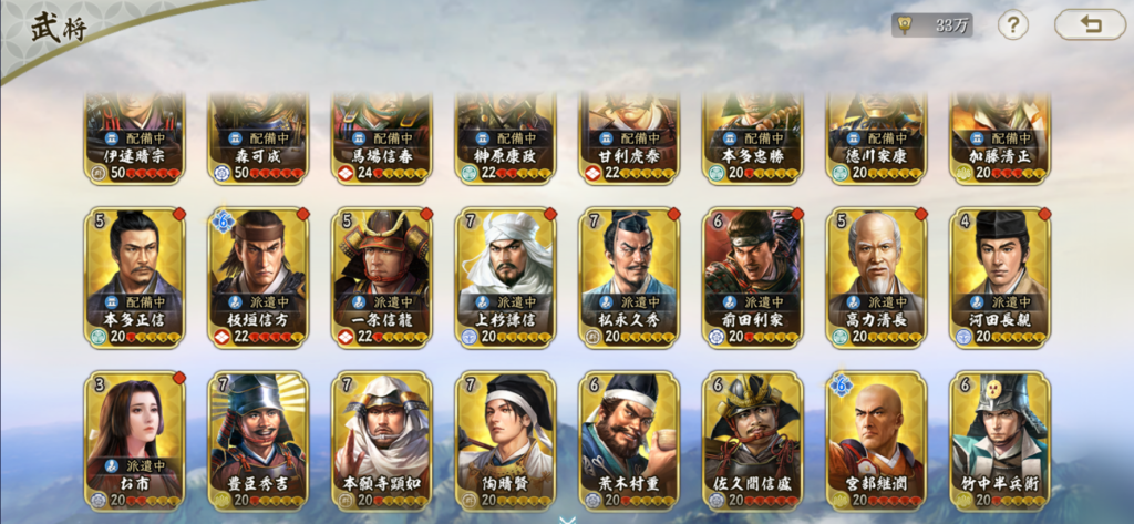 となり、ランクアップによる武将の強度は更に上昇する仕様になります。今までガチャで手に入れた武将のラインナップを見ていきましょう。