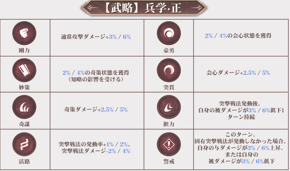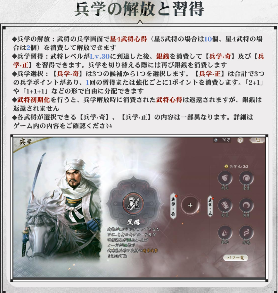 - 兵学による与ダメ増・回復量増加・被ダメ減効果を得る(NEW!)