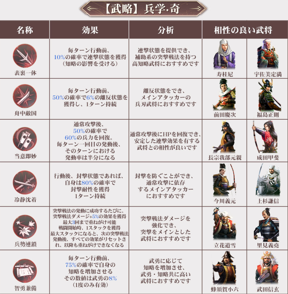 豊臣秀吉や内藤昌豊、回天転運などを使用する編成には良い兵学効果です。恐らく装備スキル「妖気」でも発動するものと思われます。