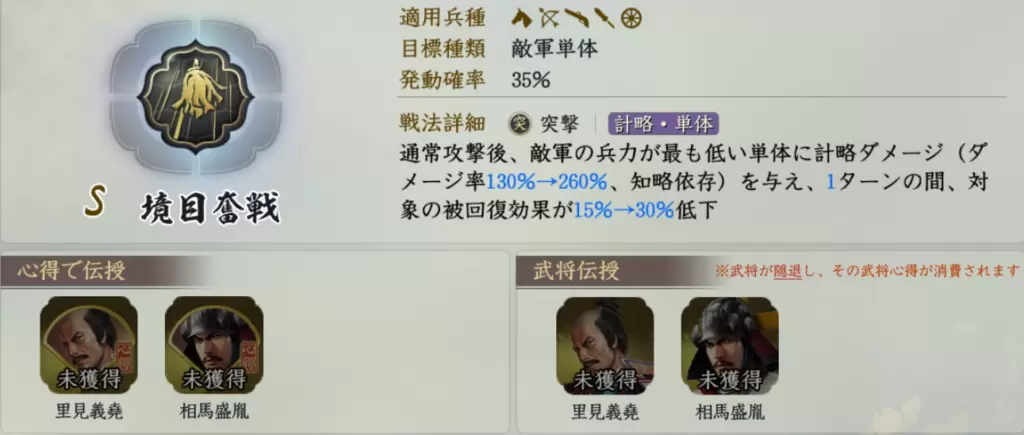 各武将が選択できる兵学内容は異なるものもあるので、兵学リストだけを見ても、その武将には欲しい兵学が含まれていない可能性もあるので、個別武将ごとにチェックをすすめましょう。