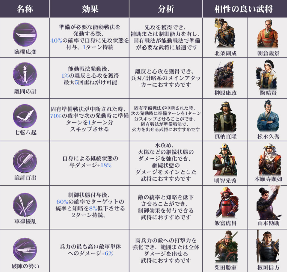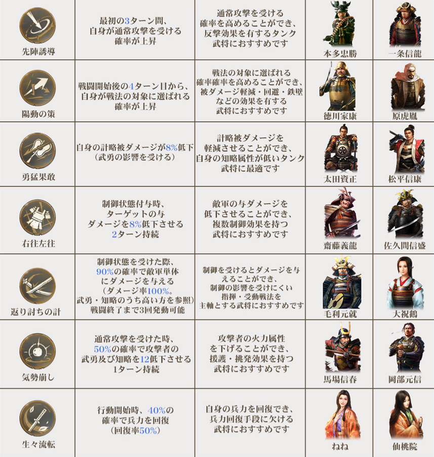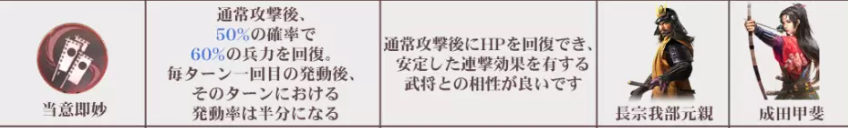 能動戦法系のアタッカー武将に向いています。相馬盛胤や一上一下などの発動率アップ系の戦法と合わせる場合もより効果的になると思います。