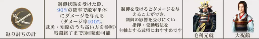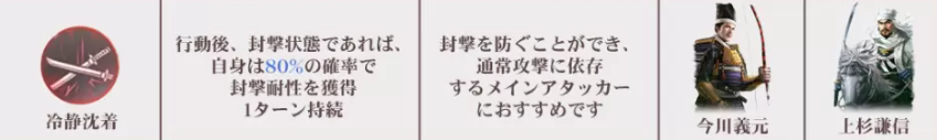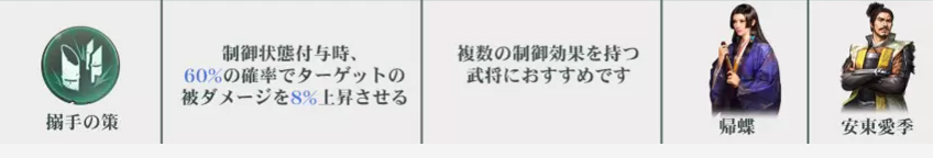 制御付与する武将に向いています。例えば北条綱成は果敢とセットで選ぶのがよさそうです。