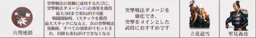 突撃戦法持ち武将には全般良いと思いますが、その中でも発動率が高い武将に向いていると思います。所持武将が不明ですが、おすすめ武将の立花道雪や里見義堯は向いていると思います。
