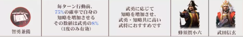知略・武勇共に高い武将に向いています。武田信玄などはその代表格だと思います。恐らく百戦錬磨などで増加させた属性値は増加後の武勇の影響を受けますが、文武両道の場合は「行動前」なので、25%で不発を引かなければ、増加後の武勇の影響を与えられないでしょう。