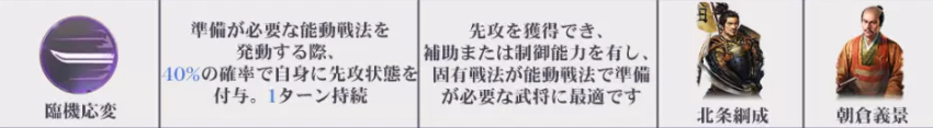 基本的に準備戦法は先攻付与と非常に相性が良く、効果的です。ダメージを先に与えるだけで被ダメを減らす効果があります。また、継続ダメージを与える松永久秀なども中毒・火傷を付与し、ダメージを与えるのは付与された敵武将のターンなので、先に付与できるというのはダメージ効率の観点からも重要です。ただ、発動率40%はやや低いように思います。