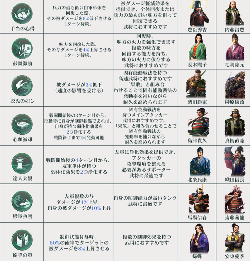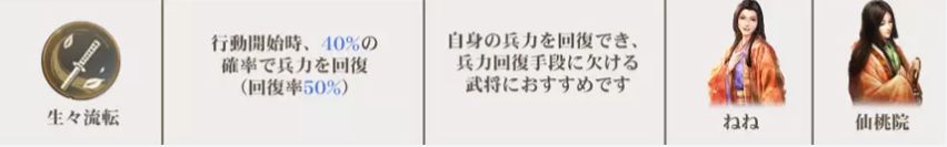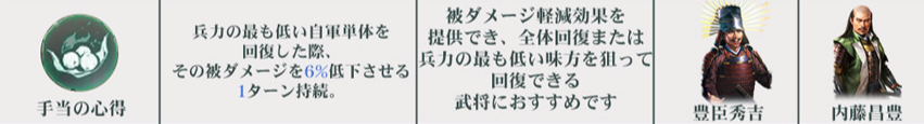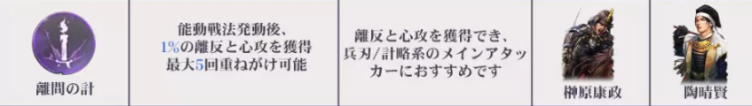 離反効果自体はそれほど大きくありませんが、使い勝手は良いと思います。発動率は50%で毎ターン発動機会があるので、塵も積もれば小山程度の回復にはなると思います。お勧め武将に福島正則がいますが、こういった主要兵刃アタッカー全般に合うと思います。