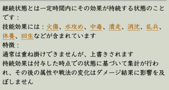 - 同効果の継続状態を付与しても上書きされるだけでダメージを増やせない