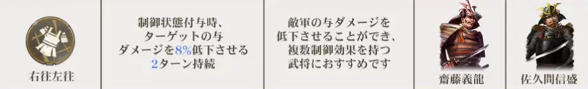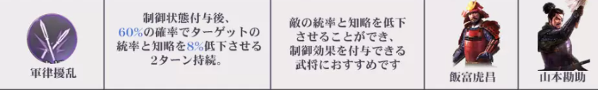 確定制御を与える戦法を持っている飯富虎昌には合うと思います。統率と知略下げなので、相手編成の耐久性が主に低下しますし、無駄がそれほどありません。多重制御可能な武将だとより合うと思います