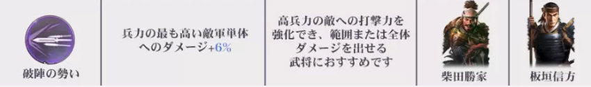 敵全体を対象とした火力戦法を持つ武将に向いています。柴田勝家は代表格だと思います。