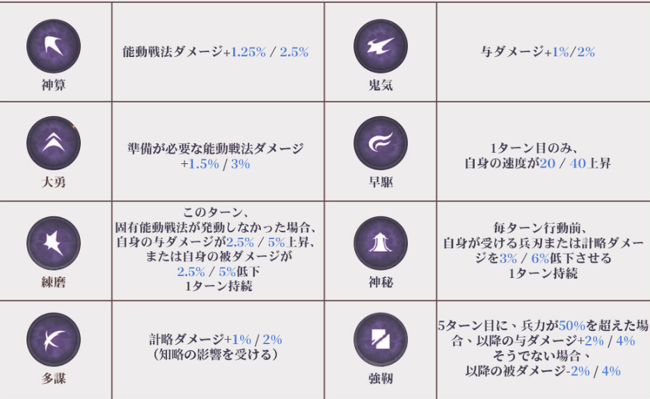 神算と違ってすべてのダメージに対応しているので、兵刃系武将なら神算よりも鬼気のほうが良いと思います