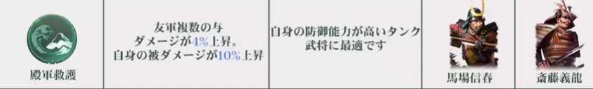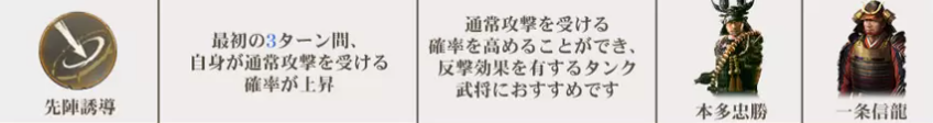 補助武将向き。自軍大将(特にアタッカーの場合はより良い)保護の目的で使用。