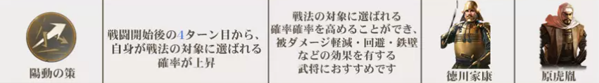 剛猛(自身が通常攻撃を受ける確率上昇)の戦法対象版ですね。ただ硬いだけのタンク武将には向いていますし、被ダメを分散させる効果にもつながるので、編成によっては悪くはないと思います。