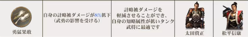 挑発系武将に向いています。または馬場信春や本多忠勝などの武将特性「剛猛」持ちにも良いでしょう。