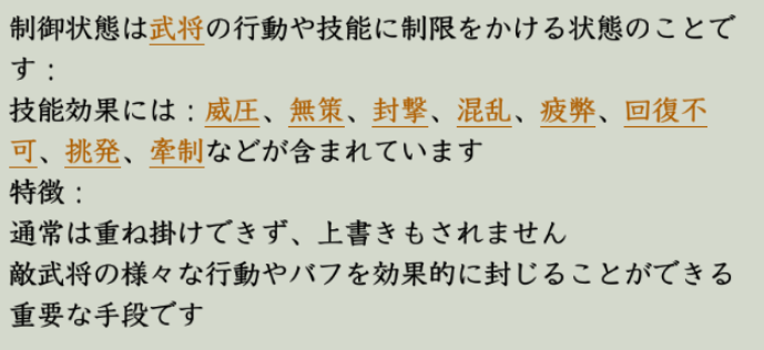 何かしら制御効果が入っていることが多いので、発動機会自体はそれなりにありそうです。特に気炎万丈などは使用率が高い戦法なので、ダメージを与える機会に恵まれそうです。また、挑発や牽制効果を持っている武将にも合うでしょう。突撃戦法にも制御付与する戦法も少なくありません。