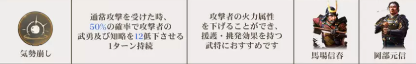 挑発系タンク武将に向いています。馬場信春のように剛猛Ⅲ(自身が通常攻撃を受ける確率大幅上昇)を持っている場合は通常攻撃を受ける機会が多いため、気勢崩しを発動する機会が特に増えるでしょう。