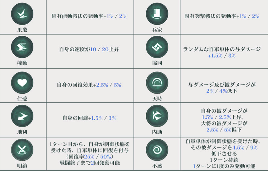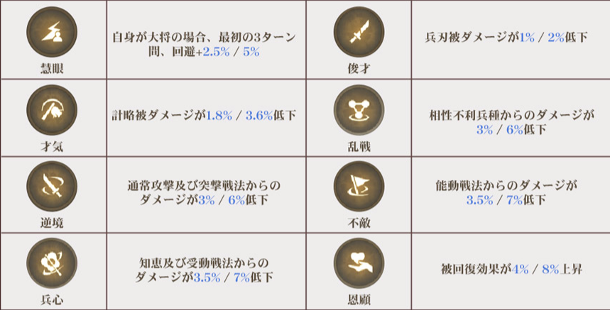 自身が大将の場合、最初の3ターンの間、回避+2.5%/5%。