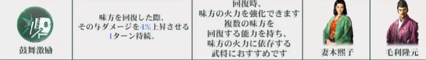 回復武将全般良いと思います。与ダメージ4%が回復した際に付与されるのは中々破格の効果だと思います。