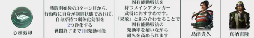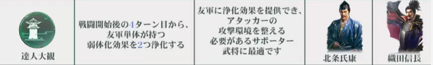 友軍単体なので、弱体効果がない友軍武将も対象と思われる。とはいえ、弱体効果は多岐にわたるので、友軍武将を浄化できるのはリターンが大きい。4ターン目などであれば継続ダメージ解除できる可能性も高そうです。心頭滅却や達人大観など浄化効果が増えるので、継続ダメージ系はやや扱いが難しいかもしれません(本願寺顕如除く)