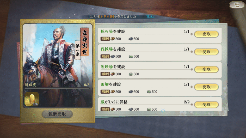| 役職が「部将Lv1」に昇進 | 100 | 30000 | |||||||||||||||