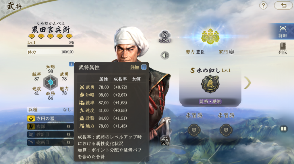 基本は秀吉副将の編成が良い。回復量がやはりずば抜けているので、耐久性能は高い。また、黒田官兵衛固有で回復を受けると奇策カウントが進むので、その点も考慮に入れると、黒田官兵衛と豊臣秀吉は高相性です。
