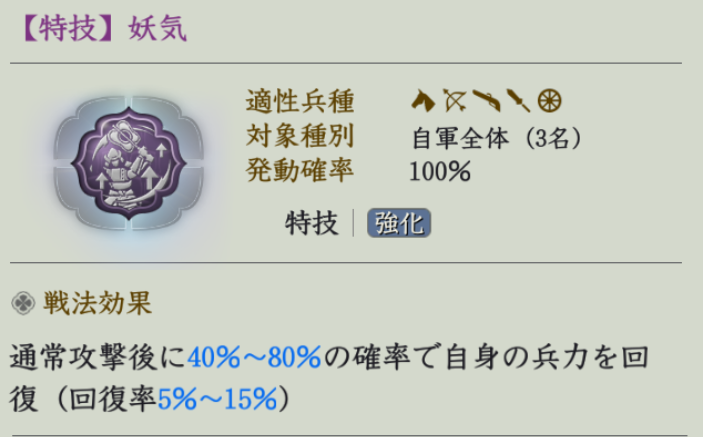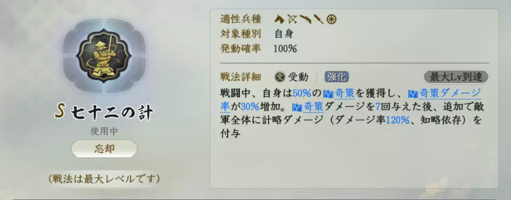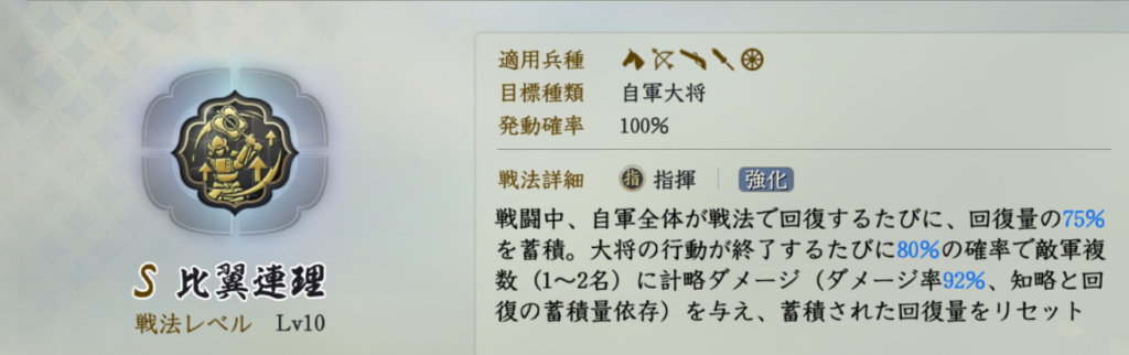 「毎ターン行動前と初めて戦法回復を受けた時に5%の奇策を獲得」については、最大で40%奇策まで上昇。また戦法回復は豊臣秀吉を思い浮かべますが、