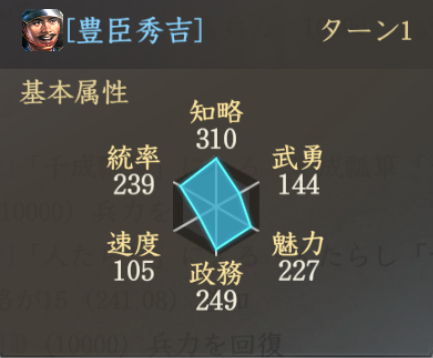 検証方法は豊臣秀吉+宮部継潤+ねねのLv50編成です。知略は豊臣秀吉と宮部継潤の数値を合わせています(人たらしで多少増加しますが)。