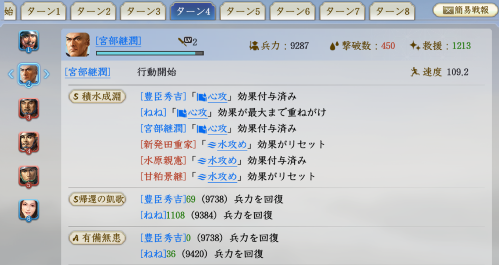 全くダメージが伸びません。このターン宮部継潤は回復0です。豊臣秀吉は1609回復しています。このことから、ねねの固有は、