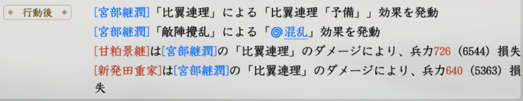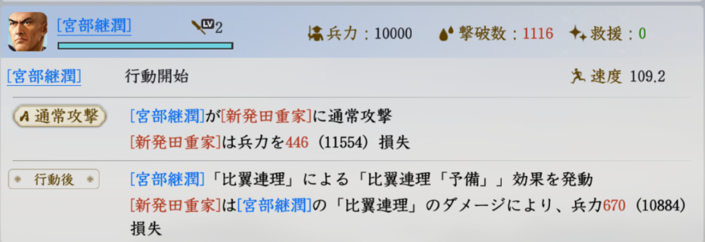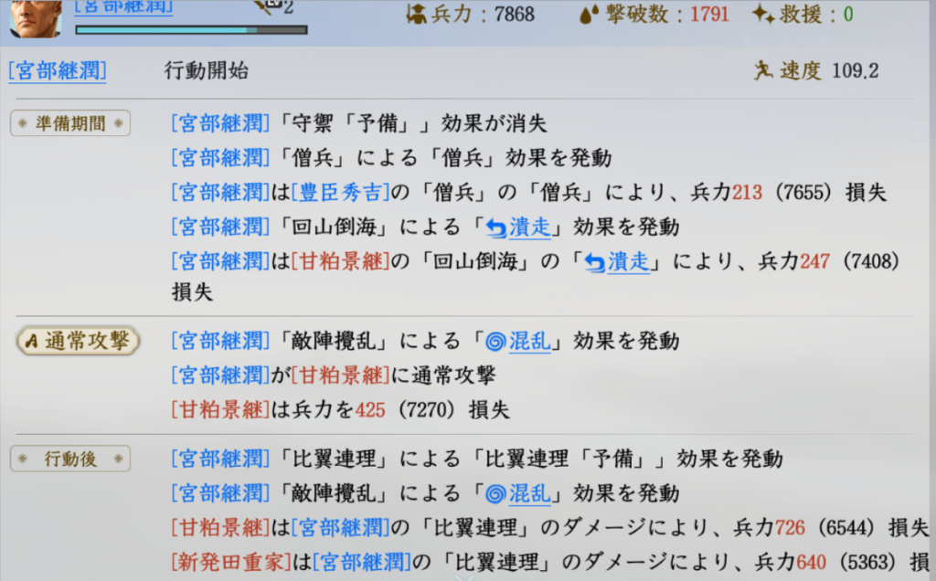 宮部継潤大将が1225回復した場合(兵力6466)、1000以上のダメージを叩き出しています。