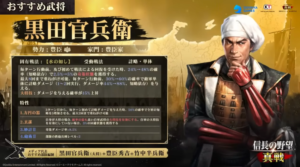 武将特性が非常に強力です。ランクアップさせろと言わんばかりの内容になっています。目標は3凸、最低1凸はしておきたい武将です。特に1凸の玄謀が強力で、統率の最も高い自軍武将の大将技を有効にする、となっているため、豊臣秀吉の統率を自軍で最も高く調整しておけば、豊臣秀吉の大将技が副将でも使えるようになります。そのため、黒田官兵衛+豊臣秀吉+ねねといった編成が可能になります。無凸の場合は豊臣秀吉の大将技が使えないため、編成強度は落ちてしまいます。