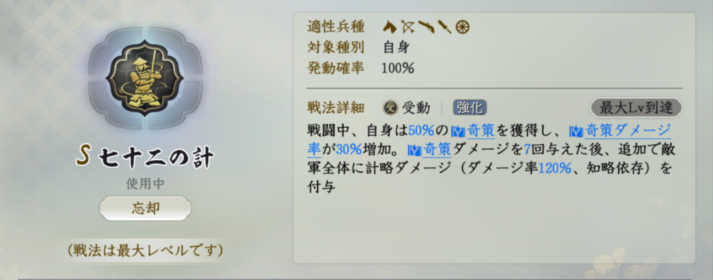 毎ターン行動前に60%の確率で計略ダメージも安定した火力になると思います。ダメージ率自体はそれほど高くありませんが、2回実行の場合は奇策込みで考えれば悪くない火力だと思います。重要なのは受動戦法なので、無策や威圧などの影響を受けずにダメージを出せる点は魅力だと思います。ただし、疲弊や混乱の影響は受けます。