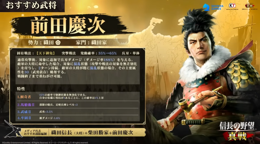 前田慶次の登場は思ったより早いなあという印象と、織田家の所属なんだなという。前田慶次といえば傾奇者ですが、ずいぶんと堅実な固有戦法だな。全然傾いていない。