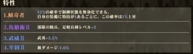 傾奇者は中々強力ですが、かなり装備依存が強いです。Wスキルを4装備すべてに持っていれば、最大20%の制御状態無効になります。これは強いです。特に封撃や混乱、疲弊、威圧など影響を受けやすそうな制御を8ターン無効化できるというのは強みだと思います。理想は3凸以上ですが、無凸でも充分使っていけそうです。