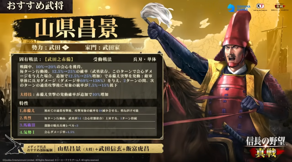 お勧め部隊編成に、「山県昌景+武田信玄+飯富虎昌」とされていますが、武田信玄の大将技はかなり強力なので、山県昌景と同時に使用するなら、武田信玄が大将のほうが良いと思います。その分山県昌景の赤備え突撃の発動率は下がりますが、仕方ありません。