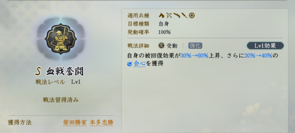 血戦奮闘は被回復効果と会心を獲得します。山形固有で20%、血戦奮闘で40%が得られます。