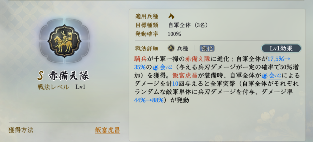 基本は会心をあげてくださいねという武将か。赤備え突撃の発動率は会心ダメージを与えたかどうかが重要になるので、前提条件をクリアしないとダメージが出せない系武将。会心率をあげるには、血戦奮闘や赤備え隊、驍勇善戦などの戦法があり、手っ取り早いのは血戦奮闘と赤備え隊です。