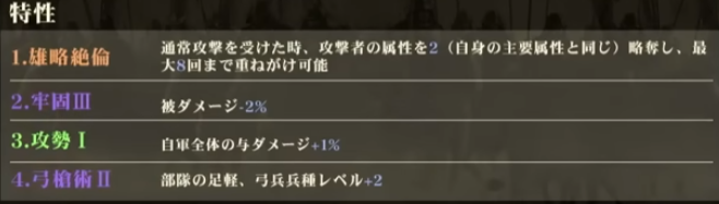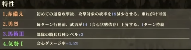 やや不明なのが、「敵軍大将がすでに混乱状態の場合、その主要属性を略奪する」なのですが、例えば、知略武将がすでに混乱状態の場合は知略を略奪するんでしょうかね。大将は割と武勇が主要属性になっている編成がそこまで多くないので、自身の強化につながるケースが少なそう。全然傾けません。まあ、強いのは強いですが。