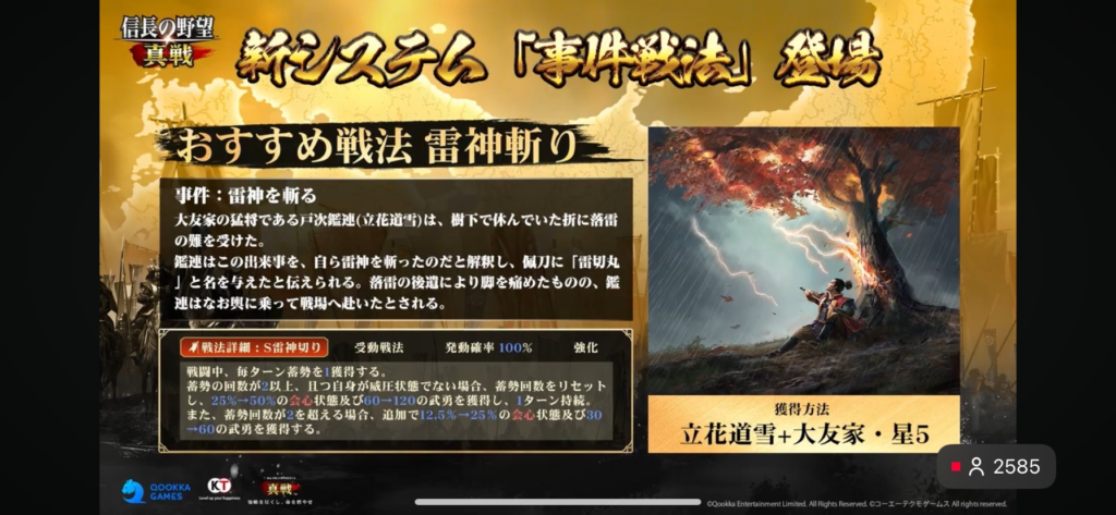 S2の事件戦法「雷神切り」も会心率を上昇させます。個人的にはリターンが小さく思えるので、それほど推奨しません。会心補助が前提なので、編成幅が狭いのも山県昌景の魅力を低下させます。