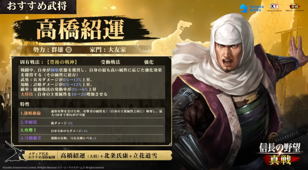 高橋紹運の武将特性の「雄略絶倫」は通常攻撃を受けたら、主要属性を略奪します。最大16上昇するので、大将技と合わせると最大36増加します。アタッカーとしても使っていける最低限の属性は確保できるということなのだと思います。補助や制御運用であれば無凸で充分だと思います。アタッカーや回復補助にするならランクアップできたほうが強度が出ると思います。