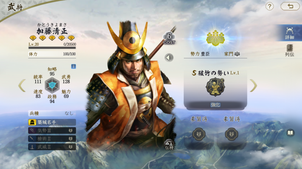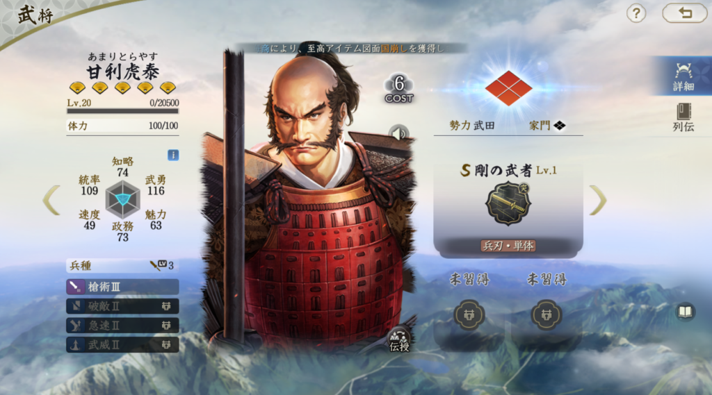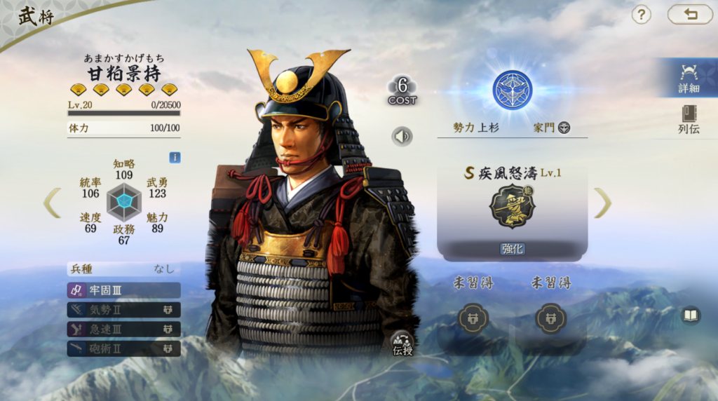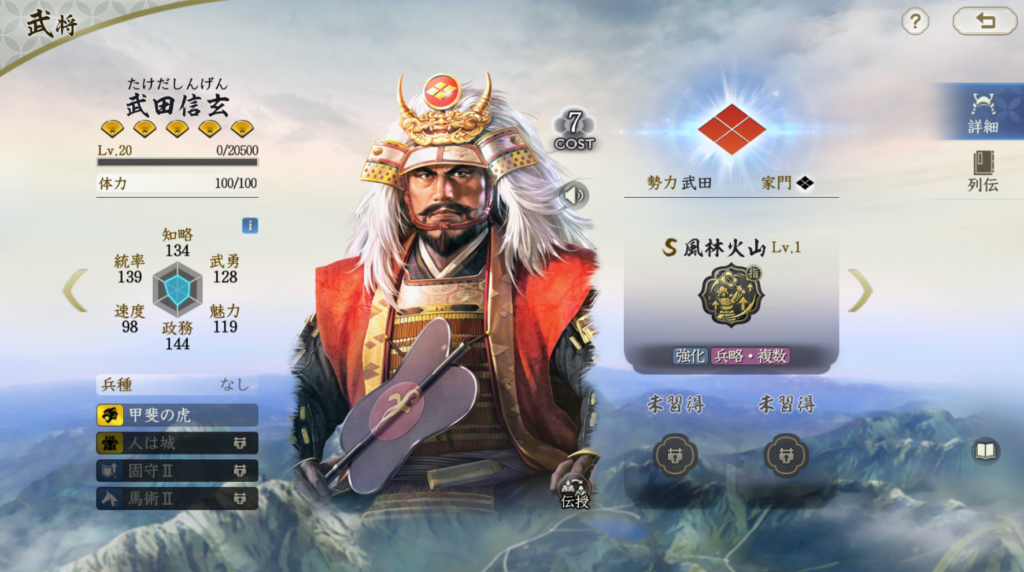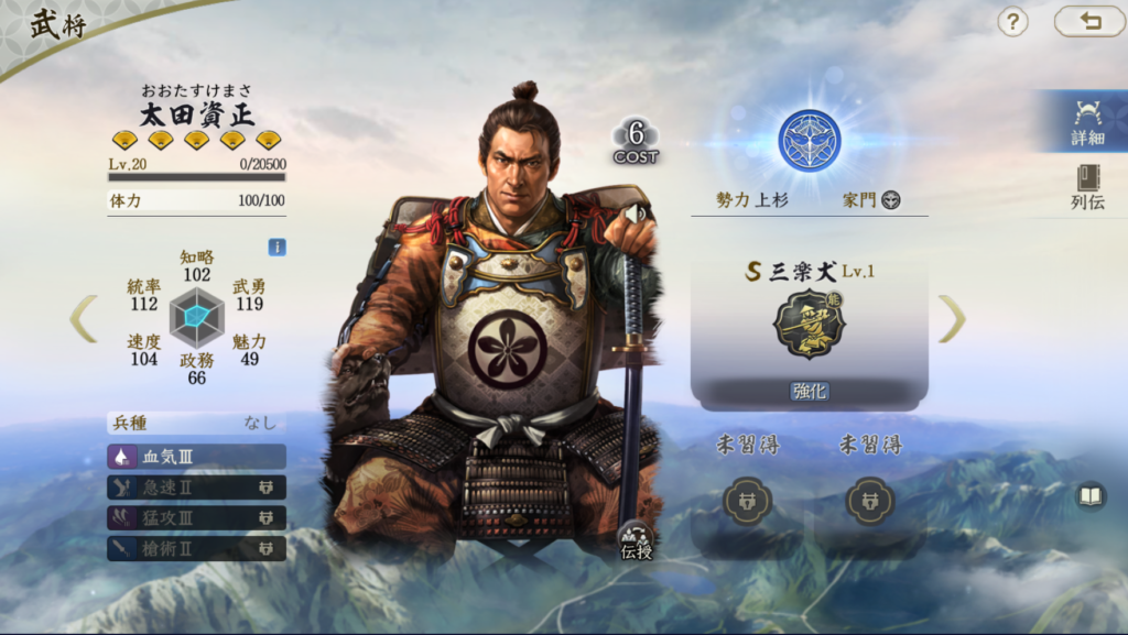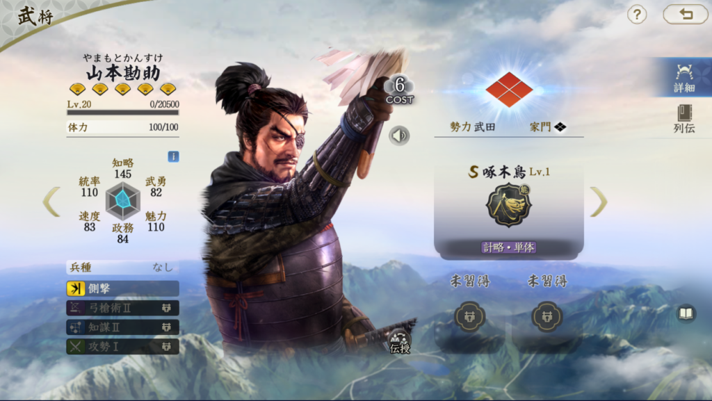 山本勘助は固有戦法で火力を充分出せる武将です。 威圧効果もたまにレベルで付与できるのも地味に強いです。 兵刃ダメージは自軍で最も武勇が高い武将を参照にするので、 飯富虎昌などの兵刃武将を使わない場合は、 武田信玄の武勇を高くしないとダメージを稼ぎにくくなります。 一行三昧や一上一下などで発動率を高めるのも良いと思います。