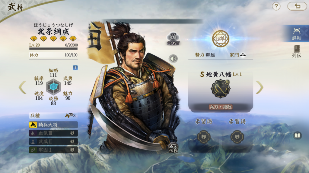 北条綱成は敵全体に封撃・無策付与が可能な武将です。速度値も高いので、 制御付与するのに向いています。地味に固有戦法の火力はかなり高いです 私は運勝の鼻+甲斐弓騎兵と合わせて使っていますが、 発動運に恵まれれば、北条綱成だけで敵部隊に何もさせずに 完勝させてくれる武将です。CBTからかなり弱体化されているのが残念です