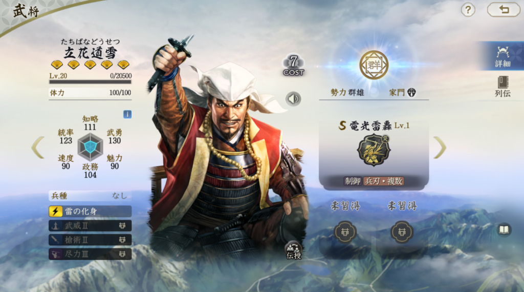 立花道雪は敵軍全体に麻痺をばらまきながらダメージを出せます。 火力自体でいえば今川義元のほうが安定して高いと思いますが、 麻痺という制御効果が優秀で、不確実ながらも 敵の行動を妨害し続けるので、ダメージを出しながら、 被ダメージを抑制できます。手数も減らせるので、 北条氏康と組ませても相性が良いです。 メインアタッカーとするにはやや火力不足という以外は優秀な武将です
